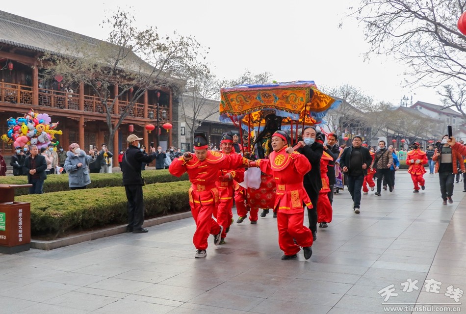 方神黑爺塑像在浩浩蕩蕩的儀仗隊伍和數(shù)萬群眾的簇擁下進入伏羲廟,落座于先天殿月臺西側(cè)。主祭人舉行明燭、焚香、化表等儀式,方神黑爺拜過伏羲之后,在儀仗隊伍和群眾的擁簇下出伏羲廟,隨抬榜文的隊伍繞伏羲城一周至西牌坊前落座。