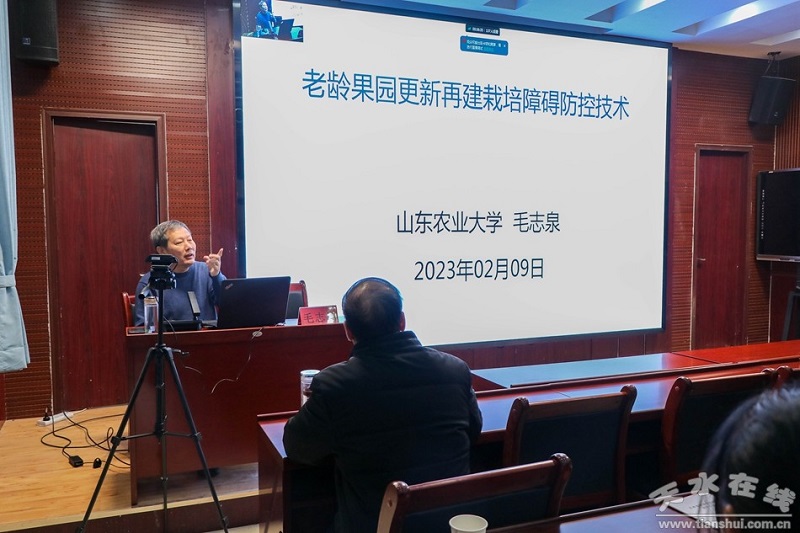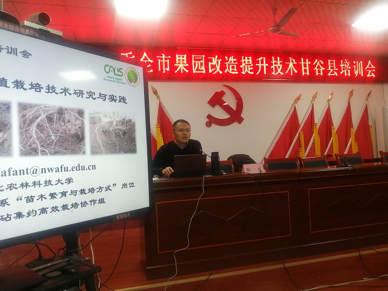在市果業(yè)辦、市果樹(shù)研究所及天水綜合試驗(yàn)站負(fù)責(zé)同志陪同下,張東教授、毛志泉教授分別在秦安、甘谷、秦州和麥積等縣區(qū)開(kāi)展培訓(xùn)。張東教授做了題為“蘋果省力化矮化密植栽培技術(shù)研究與實(shí)踐”的報(bào)告,從蘋果產(chǎn)業(yè)背景、世界蘋果發(fā)展趨勢(shì)、我國(guó)蘋果矮砧集約高效栽培技術(shù)現(xiàn)狀等方面入手,介紹了蘋果矮砧集約栽培模式的特點(diǎn)和技術(shù);毛志泉教授做了題為“老齡果園更新再建栽培障礙防控技術(shù)”的報(bào)告,分析了引起蘋果園重茬障礙的原因,介紹了老齡果園再建栽培障礙的表現(xiàn),并詳細(xì)講解了5種防控技術(shù)。專家一行還深入果園改造現(xiàn)場(chǎng),圍繞解決果園土壤連作障礙、苗木選擇、果園管理等方面進(jìn)行了指導(dǎo)。此次培訓(xùn)對(duì)象是市縣技術(shù)干部、農(nóng)民技術(shù)員、種植企業(yè)負(fù)責(zé)人和果農(nóng),采用線上線下相結(jié)合的方式進(jìn)行,累計(jì)培訓(xùn)人數(shù)達(dá)到2.8萬(wàn)人(次)。