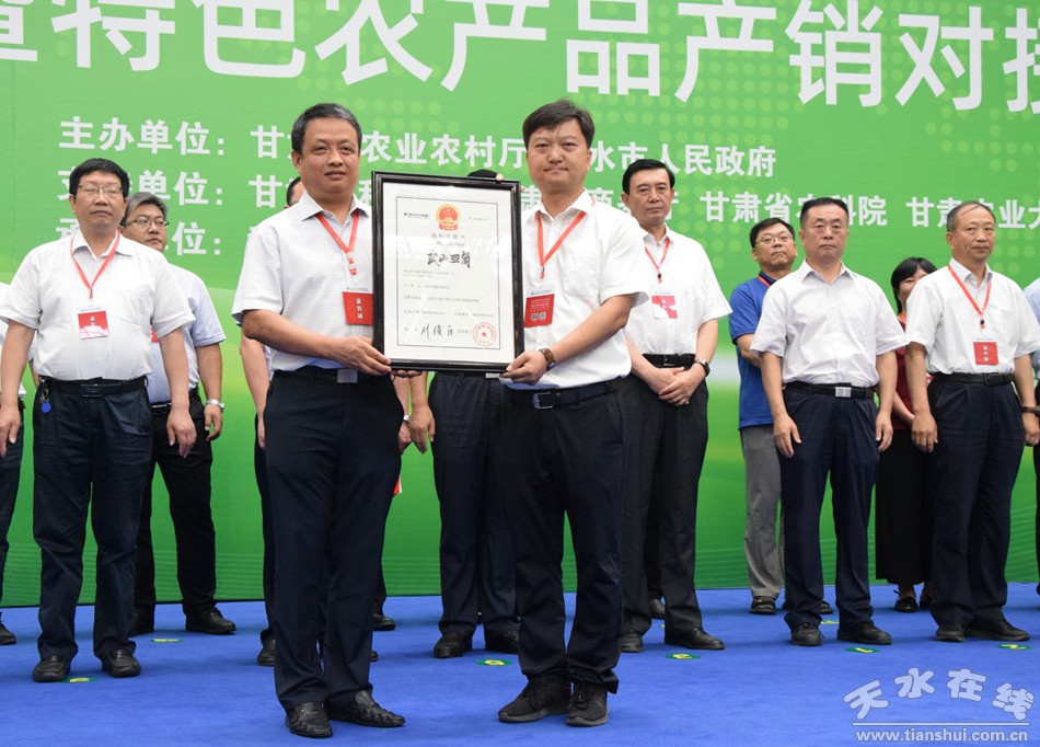 ▲甘肅省工商局副局長(zhǎng)任麗梅頒發(fā)“武山蒜苗地理標(biāo)志證明商標(biāo)”證書,武山縣委副書記閆斌接證