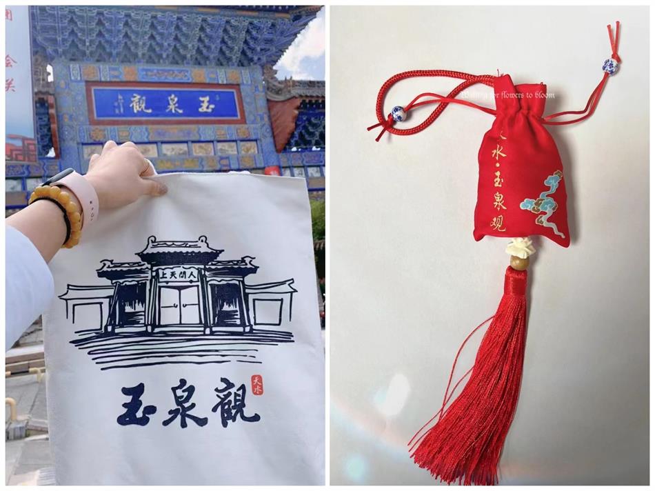 打卡特色文創(chuàng)產(chǎn)品。玉泉觀挎包:包身以玉泉觀核心建筑區(qū)“人間天上”牌樓縮略圖為依托,配有“玉泉觀”字樣,充分顯示玉泉觀宏偉的古建魅力。玉泉觀香包:內(nèi)填充天然香料,包身一面印有“天水玉泉觀”字樣,一面印有“富貴高升”“福祿吉祥”等字樣,承載著古樸名觀玉泉觀對游客的美好祝愿。