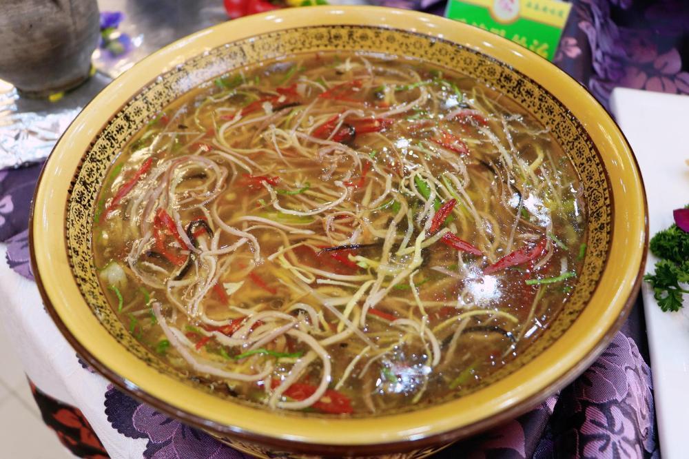 這是一道獨(dú)特的小吃。將洗凈煮熟冷卻后的豬肚切成極細(xì)的絲,用淀粉配上辣椒絲、胡椒粉、醋等佐料做成湯,文火燒制。成品湯色黃亮,肚絲漂游,吃起來(lái)酸辣可口,辣在其中,回味無(wú)窮。