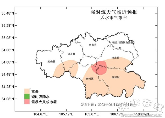 預計未來6小時,強對流云團仍將影響我市秦州區(qū)、麥積區(qū)、清水縣南部、武山縣南部和甘谷縣南部,上述地區(qū)可能出現(xiàn)雷雨天氣,并伴有陣性大風,局地可能出現(xiàn)冰雹和短時強降水,請注意防范。