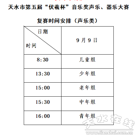 天水市第五屆“伏羲杯”音樂獎(jiǎng)聲樂、器樂大賽將于2023年9月9日舉行復(fù)賽,選手抽簽參賽具體時(shí)間安排如下: