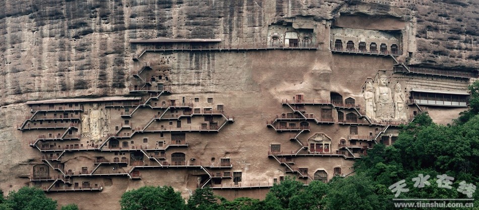 【麥積山石窟】麥積山又名麥積崖,孤峰崛起,猶如麥垛。山峰的西南面為懸崖峭壁,著名的麥積山石窟就開鑿在這峭壁上,F(xiàn)保存窟龕221個(gè),泥塑、石刻10632件,壁畫1000余平方米。麥積山周圍風(fēng)景秀麗,山巒上密布著翠柏蒼松、野花茂草,云霧陣陣,構(gòu)成了“麥積煙雨”。