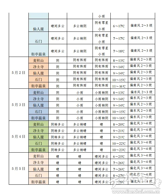 五一小長(zhǎng)假(5月1日—5月5日)麥積山大景區(qū)以陰轉(zhuǎn)多云為主,其中,1日為晴間多云,2日至3日均為陰天,4日為陰轉(zhuǎn)多云,5日為晴天,山間氣候多變,常伴有陣雨,氣溫偏低,請(qǐng)廣大游客朋友們注意保暖,隨身攜帶雨具。