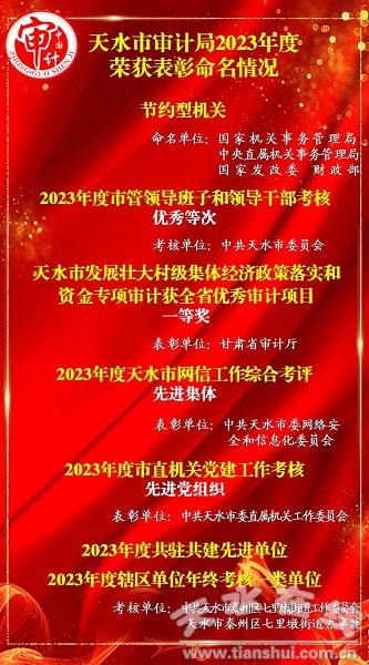 天水市審計局被國家機關(guān)事務(wù)管理局、中央直屬機關(guān)事務(wù)管理局、國家發(fā)改委、財政部授予“節(jié)約型機關(guān)”,局領(lǐng)導(dǎo)班子在2023年市管領(lǐng)導(dǎo)班子和領(lǐng)導(dǎo)干部年度考核中考評為優(yōu)秀等次,組織實施的1個審計項目榮獲省級優(yōu)秀審計項目一等獎,局機關(guān)被表彰為全市網(wǎng)信工作綜合考評先進集體,局機關(guān)黨委被授予2023年度市直機關(guān)黨建工作考核先進黨組織;局機關(guān)被表彰為秦州區(qū)七里墩街道2023年度轄區(qū)單位年終考核一類單位,同時被評為2023年度共駐共建先進單位。推薦的1名干部榮獲“全國內(nèi)部審計先進工作者”稱號,1名干部通過全省審計系列高級職稱評審,2名干部分別榮獲“全市黨委辦公系統(tǒng)先進個人”和“全市最美退役軍人”稱號,3名干部被評為全市網(wǎng)信工作專項考評先進個人,2名干部榮獲公務(wù)員三等功,19名干部榮記個人嘉獎。