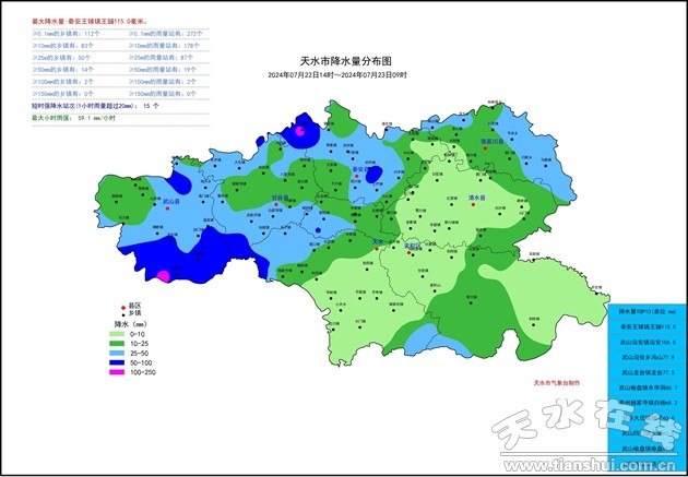 【摘要】22日午后開始我市出現(xiàn)強(qiáng)降水天氣,武山、甘谷、秦安、張家川、秦州北部及麥積北部中到大雨,武山南部、甘谷東北部與西南部、秦安西北部與中部暴雨,局地大暴雨。截止23日09時(shí),最大1小時(shí)雨強(qiáng)和最大累積降水量均出現(xiàn)在秦安王鋪鎮(zhèn),分別為59.1毫米和115毫米。各地降水情況統(tǒng)計(jì)如下: