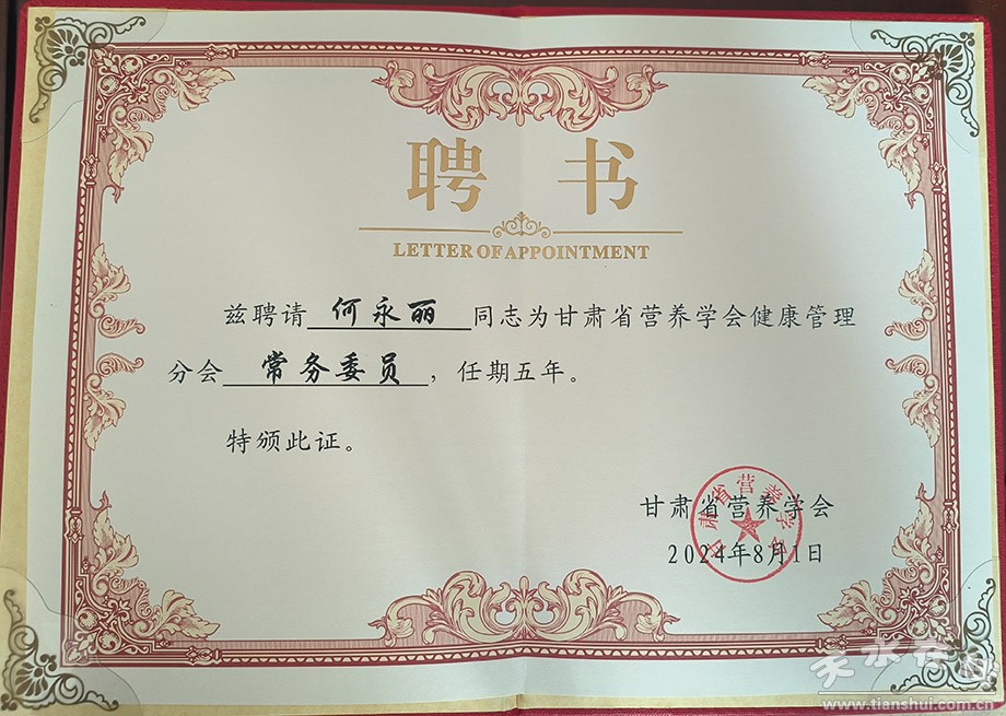 在甘肅省營養(yǎng)學會健康管理分會換屆大會中,市一院健康體檢中心主任何永麗獲聘甘肅省營養(yǎng)學會健康管理分會常務(wù)委員。