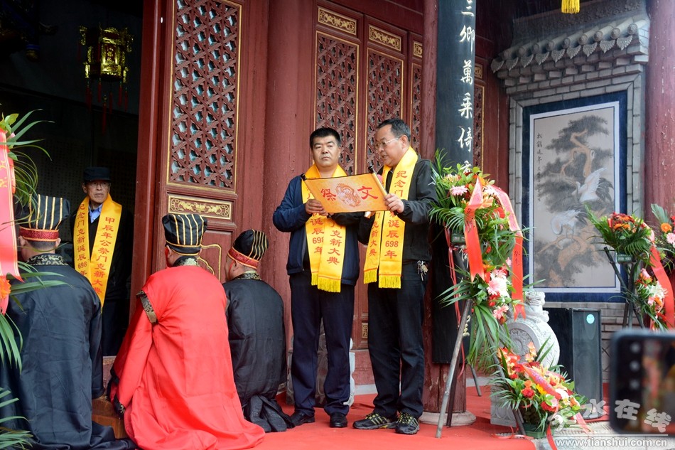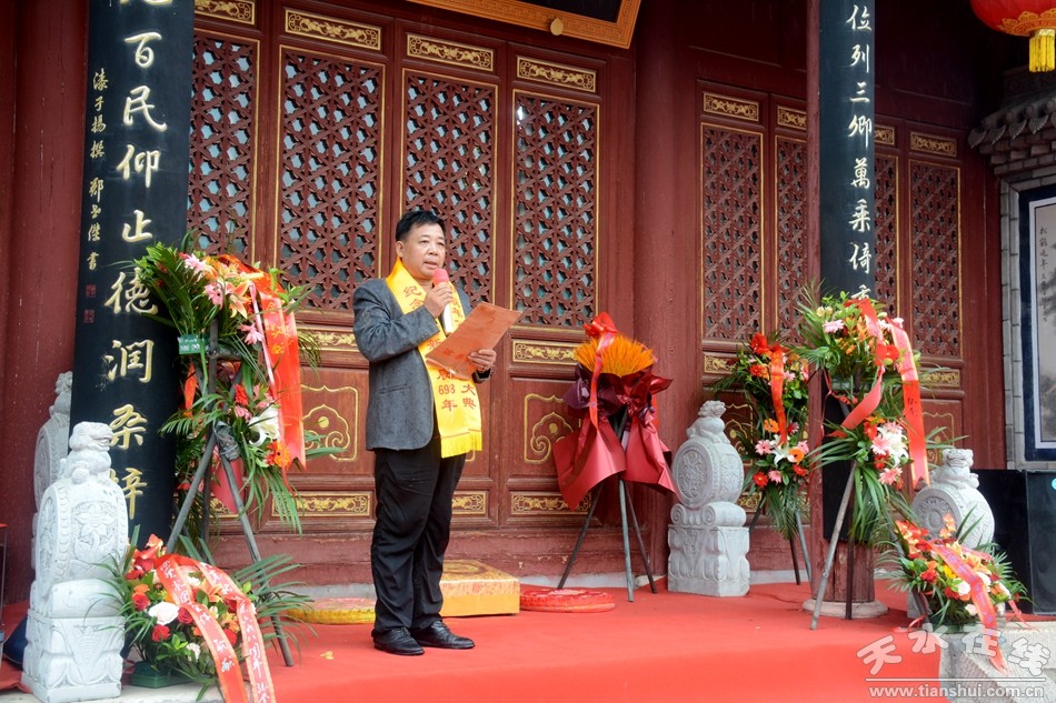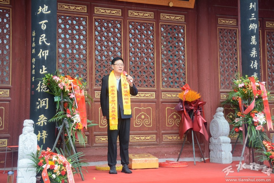 天水市政協(xié)二級調研員宋桂文先生恭讀祭文:“藉謂泱泱,文脈流暢,澤潤秦地,世代永昌。我輩感念,永世不忘。殿前祈愿:世界安定、家國榮昌,天清氣正……”祭文含義悠長深遠,表達了后輩對先祖肇建家園、開創(chuàng)文明、佑護地方發(fā)展的感恩心情。