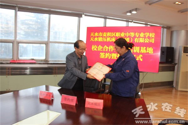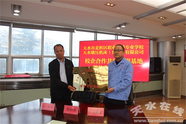 10月11日上午,天水鍛壓機床(集團)有限公司與天水市麥積區(qū)職業(yè)中等專業(yè)學校就校企合作、技能人才培養(yǎng)等事宜進行了座談交流并舉行校企合作共建實訓基地簽約暨授牌儀式。