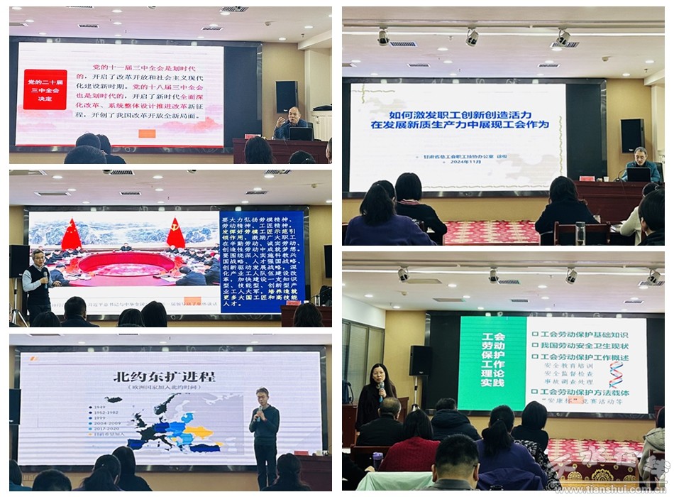 為深入學(xué)習(xí)貫徹黨的二十屆三中全會精神,貫徹落實習(xí)近平總書記關(guān)于工人階級和工會工作的重要論述特別是關(guān)于產(chǎn)業(yè)工人隊伍建設(shè)改革的重要指示精神,推動中共中央、國務(wù)院《關(guān)于深化產(chǎn)業(yè)工人隊伍建設(shè)改革的意見》落實落地,進(jìn)一步做好勞動保護(hù)、職工創(chuàng)新、工匠培育和勞模創(chuàng)新工作室建設(shè)等工會重點工作,11月25日至29日,全省工會深化產(chǎn)業(yè)工人隊伍建設(shè)改革和經(jīng)濟(jì)技術(shù)工作培訓(xùn)班在天水舉辦。來自全省各市州總工會、蘭州新區(qū)總工會,部分省級產(chǎn)業(yè)(系統(tǒng))工會、縣區(qū)工會分管領(lǐng)導(dǎo)和相關(guān)部門負(fù)責(zé)同志共60余人參加培訓(xùn)。