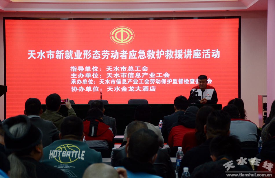 為提高新就業(yè)形態(tài)勞動者的應(yīng)急能力,學(xué)會自我防護(hù)和緊急救助他人的正確方法,11月29日下午,天水市信息產(chǎn)業(yè)工會開展了“新就業(yè)形態(tài)勞動者自我防護(hù)與應(yīng)急救援”主題講座,來自全市快遞員、網(wǎng)約送餐員、網(wǎng)約車司機(jī)、網(wǎng)絡(luò)主播等新就業(yè)形態(tài)勞動者80人聆聽了講座。