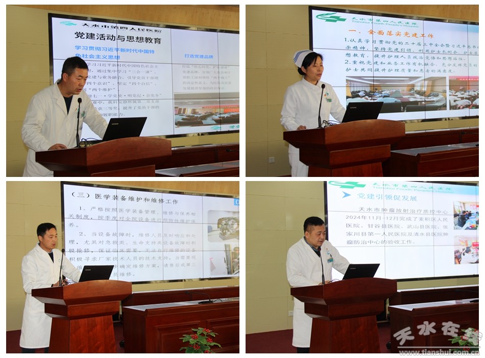 述職大會(huì)上,各職能、臨床、醫(yī)技科室主任,護(hù)士長(zhǎng)從黨建引領(lǐng)、科室管理、目標(biāo)責(zé)任落實(shí)、學(xué)科發(fā)展、人才培養(yǎng)等方面全面匯報(bào)了2024年重點(diǎn)工作任務(wù)完成情況和履職盡責(zé)情況;通過(guò)數(shù)據(jù)對(duì)比、查擺不足、談舉措計(jì)劃,深入剖析了發(fā)展中存在的短板弱項(xiàng),重點(diǎn)針對(duì)2025年發(fā)展目標(biāo)和措施進(jìn)行了規(guī)劃與展望。同時(shí)對(duì)科室和中層干部述職情況進(jìn)行了現(xiàn)場(chǎng)測(cè)評(píng)打分。