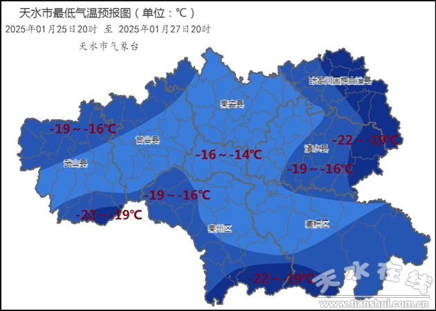 降雪結(jié)束之后,受強(qiáng)冷空氣、晴空輻射和融雪等綜合影響,預(yù)計(jì)26日~27日全市將出現(xiàn)寒潮天氣,張家川縣、清水縣、武山縣北部和南部、甘谷縣北部、秦州區(qū)南部、麥積區(qū)南部為強(qiáng)寒潮。全市最低氣溫將出現(xiàn)在27日清晨,城區(qū)最低氣溫-19~-14℃,高海拔地區(qū)-22~-19℃。