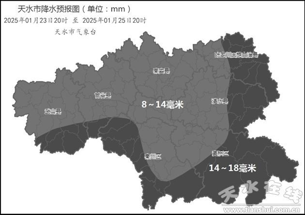 預(yù)計(jì)23日夜間至25日白天,全市將出現(xiàn)大范圍雨雪天氣,前期以雨夾雪為主,24日上午開始陸續(xù)轉(zhuǎn)為雪。主要降雪時(shí)段為24日11時(shí)至25日08時(shí),全市中到大雪,其中張家川縣東部、清水縣東部、麥積區(qū)東南部、秦州區(qū)西部和南部、武山縣南部、甘谷縣南部鄉(xiāng)鎮(zhèn)暴雪,最大累積降水量14~18毫米,山區(qū)最大積雪深度15~20厘米。