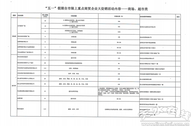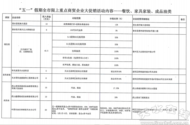 為持續(xù)激活消費(fèi)市場(chǎng),充分發(fā)揮消費(fèi)對(duì)經(jīng)濟(jì)的基礎(chǔ)作用,市縣區(qū)商務(wù)局動(dòng)員商場(chǎng)、超市、家電、餐飲、汽車、家具、成品油、電動(dòng)車8類45家企業(yè)投入1841萬(wàn)元,在“五一”期間開展“企補(bǔ)”促消費(fèi)活動(dòng)。
