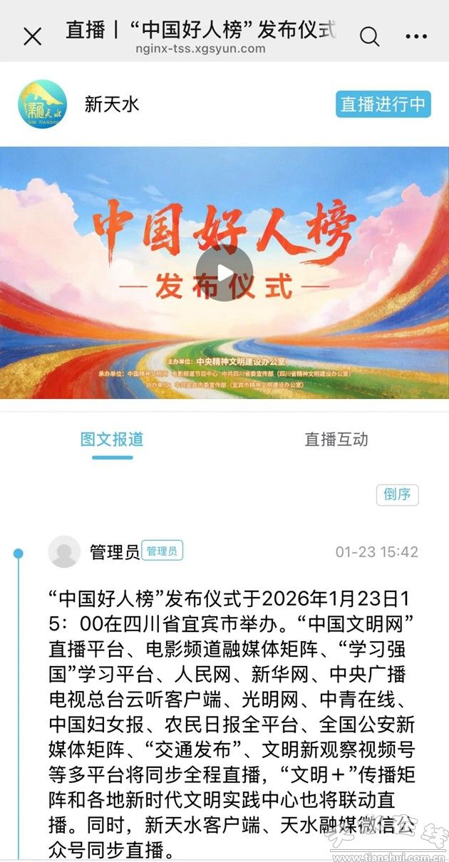 1月23日下午,“中國好人榜”發(fā)布儀式在四川省宜賓市隆重舉辦,天水市文明辦組織全市各縣區(qū)機關(guān)單位、鄉(xiāng)鎮(zhèn)(街道)、村(社區(qū))干部群眾,依托新時代文明實踐中心(所、站)等地,通過集中收看、線上點播等多種形式同步觀看直播,掀起學(xué)習(xí)好人、致敬好人、爭當好人的熱潮。?