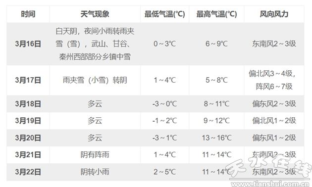 實況:上周天氣以晴或多云為主,氣溫較前期偏低,12日~14日出現明顯降溫及雨雪天氣,13日夜間至14日上午全市普降大雪,清水縣大部、張家川縣大部、秦州區(qū)西部和南部、麥積區(qū)中東部、武山縣南部出現暴雪,積雪深度達10厘米以上。目前,全市大部地區(qū)土壤均為正常至過濕狀態(tài),土壤墑情適宜。