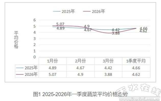 據(jù)市蔬菜辦對天水江楠和天水瀛池市場蔬菜價格跟蹤監(jiān)測:一季度重點監(jiān)測的21種蔬菜(大白菜、西紅柿、黃瓜、青椒、油菜、芹菜、馬鈴薯、白蘿卜、菠菜、茄子、豆角、甘藍、胡蘿卜、菜花、韭菜、蒜苔、大蔥、萵筍、西葫蘆、大蒜、洋蔥)平均批發(fā)價為4.62元/公斤,同比下降0.86%,與上年度相比1月和2月蔬菜價格走勢相近,3月價格呈下降趨勢(見圖1)。