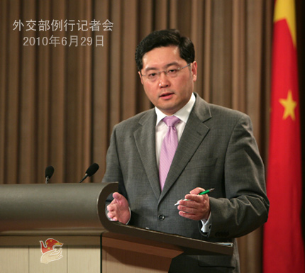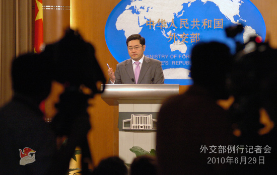 2010年6月29日,外交部發(fā)言人秦剛舉行例行記者會。答問如下。 秦剛:女士們、先生們,大家下午好!首先發(fā)布兩條消息: