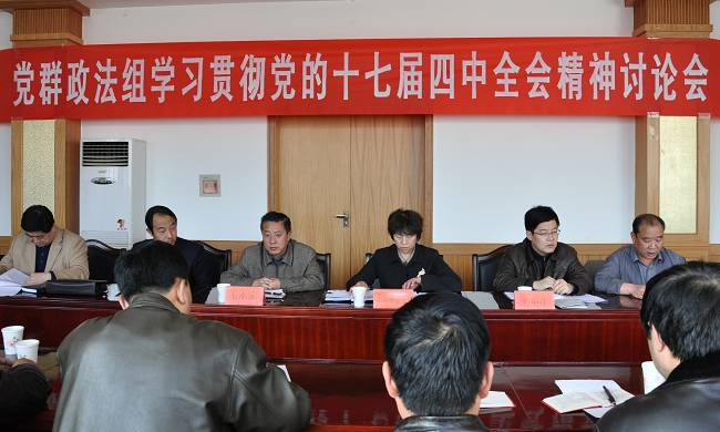 為了深入學(xué)習(xí)貫徹黨的十七屆四中全會(huì)精神,努力提高全縣各級(jí)干部運(yùn)用黨的最新理論成果指導(dǎo)實(shí)踐、推動(dòng)發(fā)展的能力,12月4日,武山縣黨群政法系統(tǒng)召開(kāi)學(xué)習(xí)貫徹黨的十七屆四中全會(huì)精神討論會(huì)議,縣委辦、公安局、組織部、宣傳部等21個(gè)部門(mén)的主要領(lǐng)導(dǎo)和黨組織負(fù)責(zé)人參加了討論會(huì)議。會(huì)議由縣委常委、政法委書(shū)記毛更生主持,縣委書(shū)記溫利平、縣人大常委會(huì)主任王永宏應(yīng)邀出席指導(dǎo)會(huì)議。