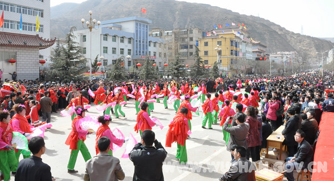 歡快的鑼鼓敲起來(lái),喜慶的秧歌扭起來(lái),2月28日(正月十五日),武山縣城鑼鼓喧天、人氣鼎沸,由各鄉(xiāng)鎮(zhèn)農(nóng)民、街道居民、機(jī)關(guān)干部、學(xué)校師生等組成的秧歌隊(duì)在這里舉行隆重匯演,風(fēng)趣幽默的舞蹈、花團(tuán)錦簇的彩車(chē)、騰空飛舞的長(zhǎng)龍、狂奔跳躍的雄獅和氣勢(shì)磅礴的旋鼓等地方特色鮮明、鄉(xiāng)土氣息濃厚的民俗文藝節(jié)目,巡演在縣城內(nèi)的主要街道和廣場(chǎng)上。他們以自己精彩的表演,強(qiáng)烈表達(dá)了對(duì)美好生活的熱愛(ài)與憧憬?h城大街小巷人頭攢動(dòng),熱鬧非凡,10萬(wàn)多名群眾云集街頭,觀看這場(chǎng)以“和諧之春”為主題的秧歌匯演。