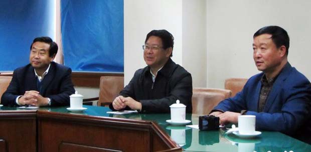 武山縣委書記張建杰(中)匯報工作 縣長索鴻賓(左) 副縣長常飛(右)