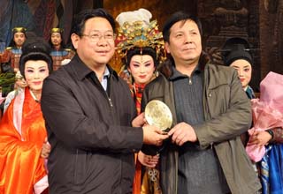 (縣委書記張建杰向演出人員贈送武山世界摩崖大佛祈福銅鏡 )