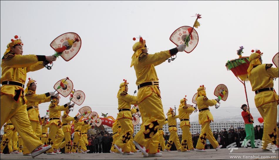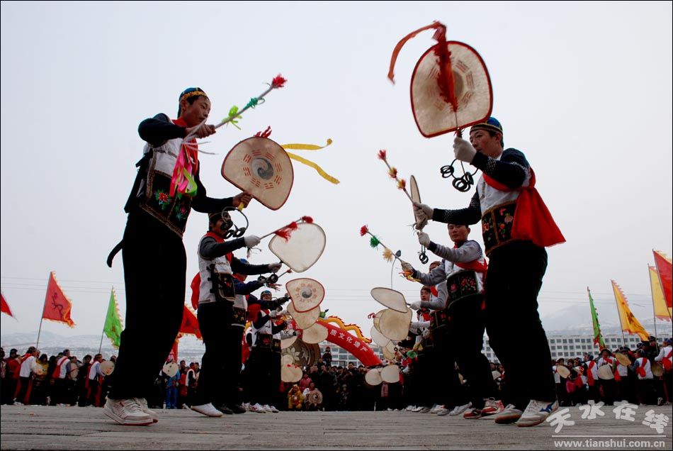 武山旋鼓又稱扇鼓或鼙鼓,始于漢、興于宋、盛于明,被載入《中國民間·甘肅卷》,被攝入電影《追索》,參加了第四屆中國藝術(shù)節(jié)、首屆絲綢之路節(jié)、中國西部商品交易會、歷屆天水伏羲公祭活動的演出,獲得了甘肅省群星藝術(shù)節(jié)銅獎和首屆絲綢之路節(jié)優(yōu)秀表演獎,進入中國八大名鼓之列,并成功列入國家級非物質(zhì)文化遺產(chǎn)名錄。 武山旋鼓基本舞步為進行式和富于變化的圓場式。表演時僅以芒鑼和搖環(huán)配合,主要根據(jù)鼓棰敲擊鼓點有規(guī)律的節(jié)奏,變化出明快奔放的舞姿和各種隊列造型:“蛇脫皮”、“二龍戲珠”、“雙鳳朝陽”、“白馬分鬃”、“獅子滾繡球”、“太子游四門”、“十字嵌梅花”、“九折十八式”等。鼓動中,有時如彩云過路,行步自如;有時如百花盛開,層層圍攏;有時勇武驕健、似鷹擊長空;有時縱橫穿梭,歡奔如織;有時又排列出“歡慶豐收”、“萬民同樂”等字樣,寄托美好的寓意。