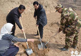 3月18日,省公安廳副廳長王建設(shè)、省警衛(wèi)局局長王林帶隊(duì)的聯(lián)村聯(lián)戶幫扶組公安干警,拿起鋤頭,拎著水桶,扛著樹苗,走進(jìn)聯(lián)系點(diǎn)武山縣城關(guān)鎮(zhèn)張灣村的山地里,與縣委書記張建杰、縣委常委政法委書記李曉東、縣委常委城關(guān)鎮(zhèn)黨委書記柳選植及當(dāng)?shù)厝罕娨黄鹜诳、植苗、培土、澆水,現(xiàn)場鋤頭舞動(dòng)、腳步奔走、汗水揮灑、談笑默契,一邊忙忙碌碌的干著活,一邊親親切切的聊著天,呈現(xiàn)出一派警民魚水一家親的和諧景象。不知不覺已到了晌午時(shí)分,在幫扶組的公安干警和群眾的共同努力下,5000多株核桃樹苗已被整整齊齊的栽植在了村民的田地里。