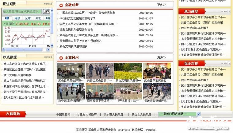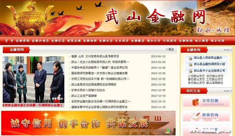 武山金融網(wǎng)站(http://www.wushan.gov.cn/zfb/index.htm)是武山縣金融機(jī)構(gòu)對(duì)外開展交流,展示最新金融產(chǎn)品,開展金融服務(wù),推進(jìn)政、銀、企融資合作交流的重要平臺(tái)。武山金融網(wǎng)涵蓋了“金融要聞”、“投資理財(cái)”、“金融服務(wù)”等13個(gè)欄目,網(wǎng)站欄目豐富,網(wǎng)頁風(fēng)格新穎,有較強(qiáng)的專業(yè)性,是金融行業(yè)的一部“百科全書”。