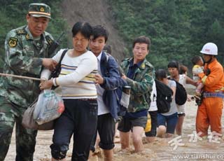 26日,根據(jù)前方災(zāi)情,消防大隊(duì)出動搶險(xiǎn)救援車1臺,隊(duì)員8名,挺進(jìn)搶險(xiǎn)救援重災(zāi)區(qū)四門鎮(zhèn)松樹村,當(dāng)搶險(xiǎn)救援車趕到堯兒村時,發(fā)現(xiàn)前方道路塌陷,搶險(xiǎn)救援車無法通行,全體消防隊(duì)員只好汽車從簡,獨(dú)步繞行,順著山勢,攀巖約25公里,歷時3個多小時,13時50分來到受災(zāi)嚴(yán)重的松樹村?粗矍氨簧胶榍滞踢^的村莊,消防隊(duì)員忘記山路所帶來的疲憊,迅速投入到抗洪搶險(xiǎn)救援中,幫助村民迅速轉(zhuǎn)移物資,搭建帳篷,指導(dǎo)村民開展自防自救,確保人身安全。據(jù)不完全統(tǒng)計(jì),消防隊(duì)員共救助轉(zhuǎn)移被困群眾12人,糧食1200公斤、家電、家具等物資108件,搶救財(cái)產(chǎn)價(jià)值1.3萬元,并幫助群眾搭建帳篷12頂。