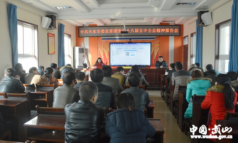 12月10日,中共天水市委宣講團黨的十八屆五中全會精神報告會在武山縣舉行。天水市委宣講團第三宣講組主講人、市委農(nóng)工部部長張思佳在主會場做了專題宣講?h四大組織在家領(lǐng)導(dǎo)、縣直各部門及各鄉(xiāng)鎮(zhèn)負責(zé)人聆聽了報告會。報告會由縣委常委、宣傳部長柳選植主持。