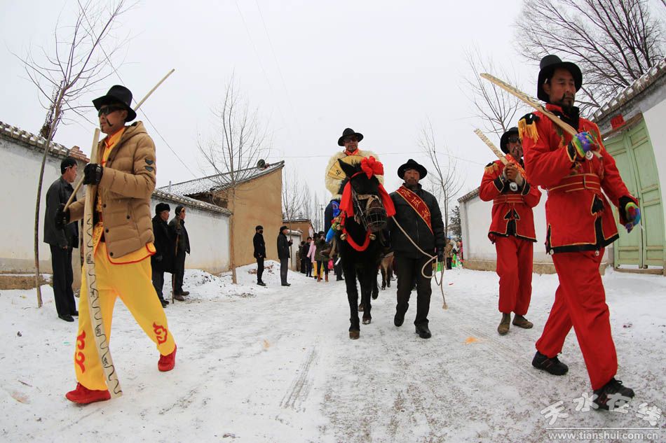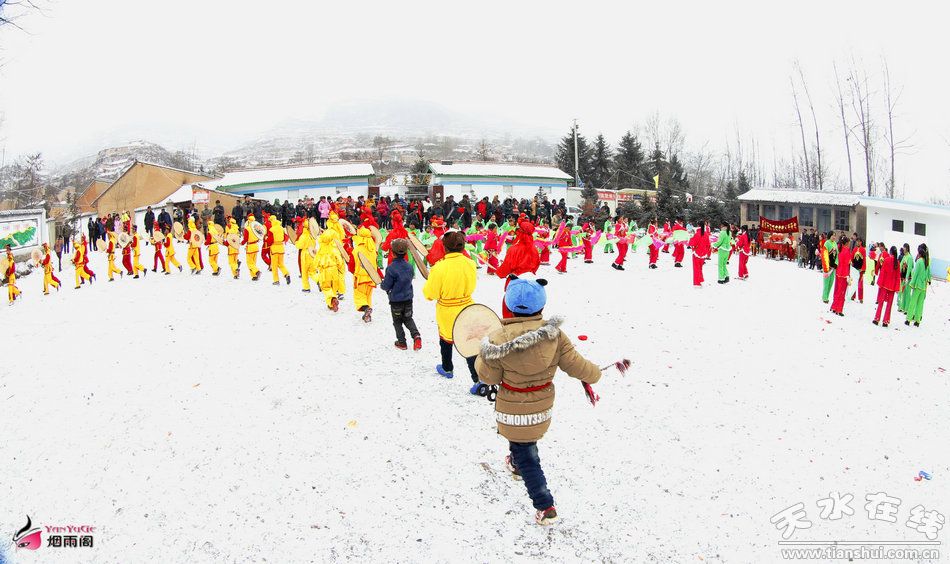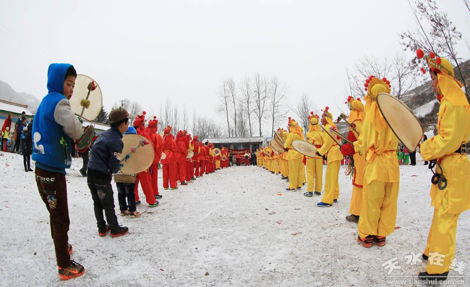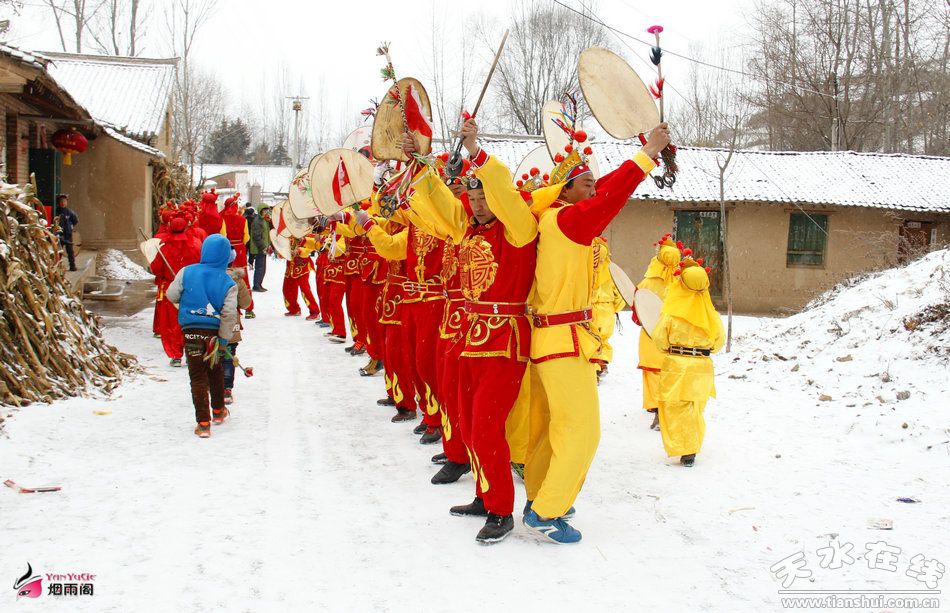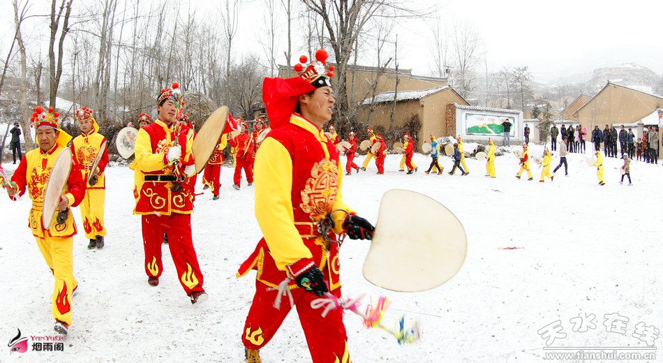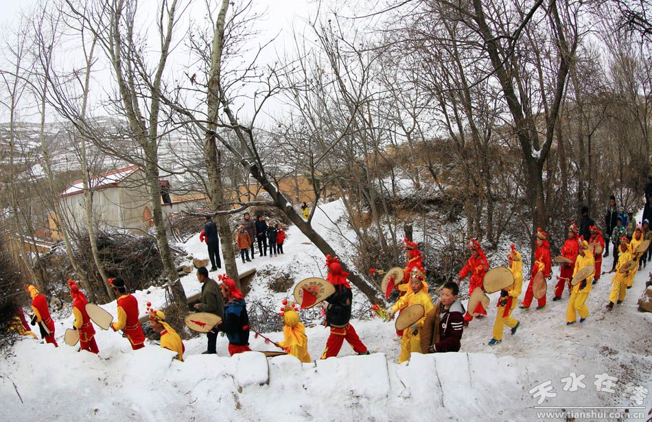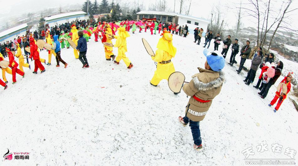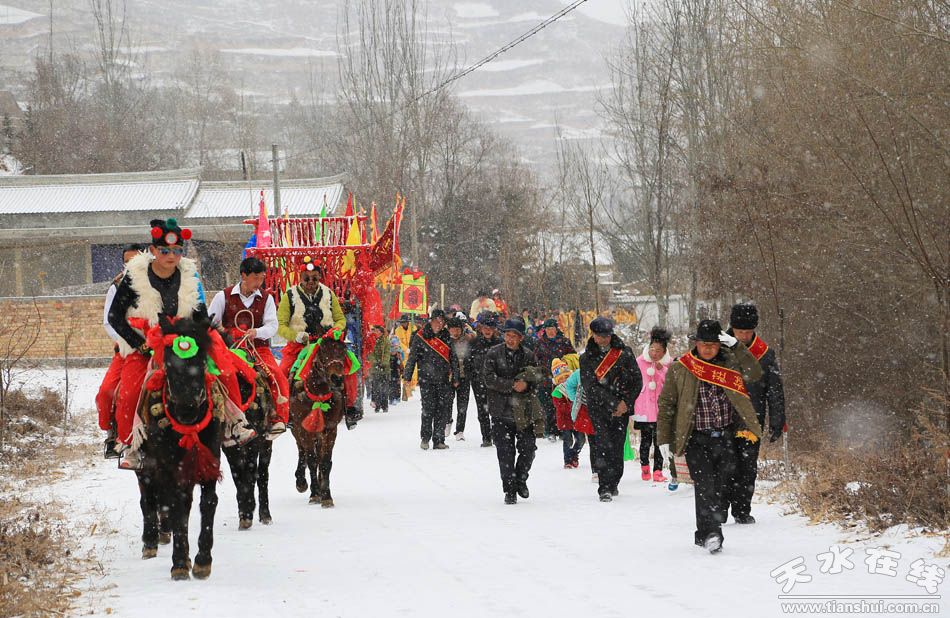 2月12日,大年初五,一場不期而至的瑞雪灑落在天水大地,天水在線一行不顧天寒地凍,道路難行,冒著大雪專程驅(qū)車來到武山縣灘歌鎮(zhèn)費莊村拍攝社火表演。