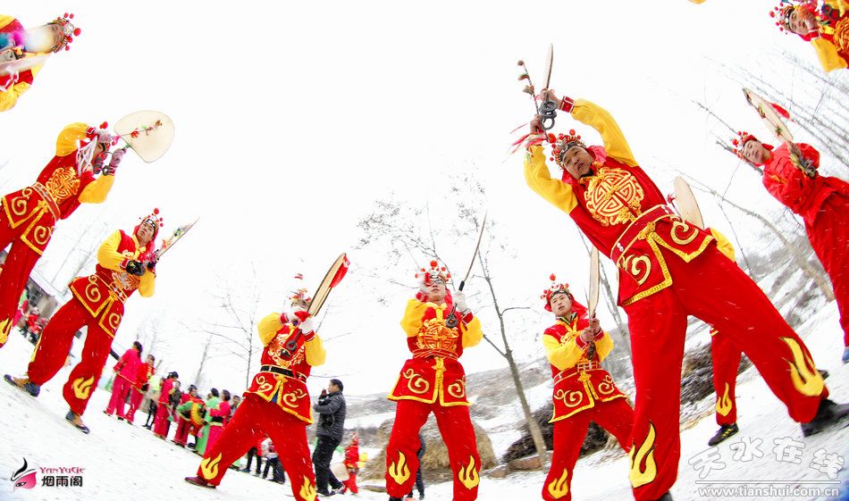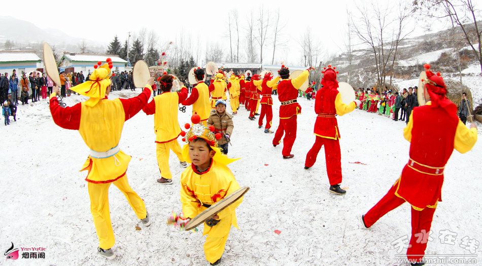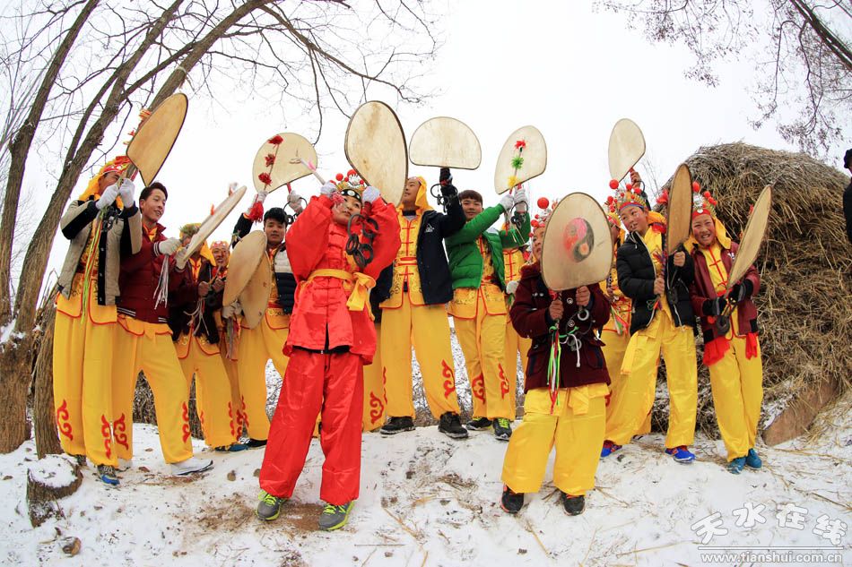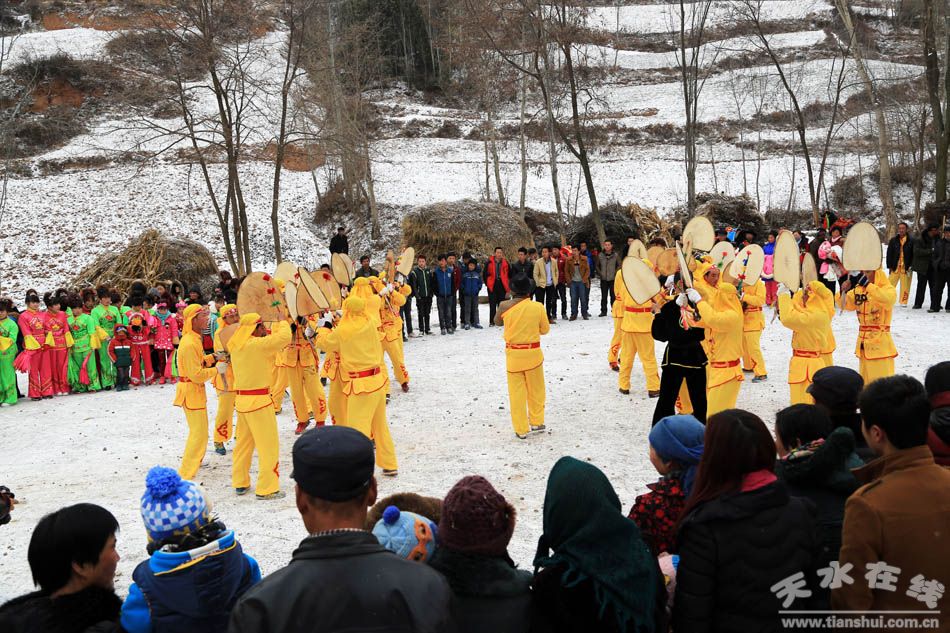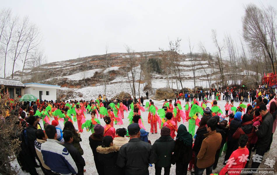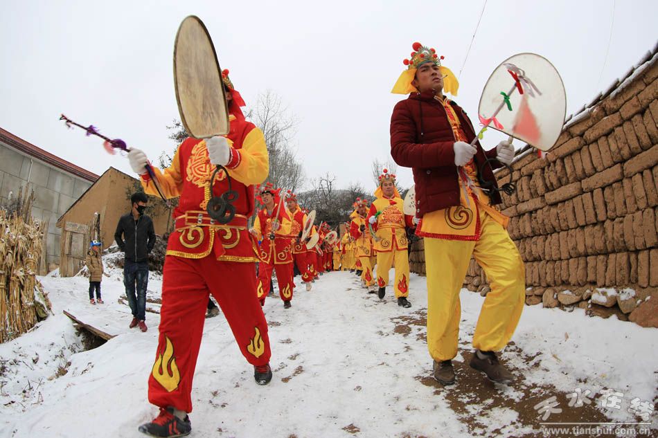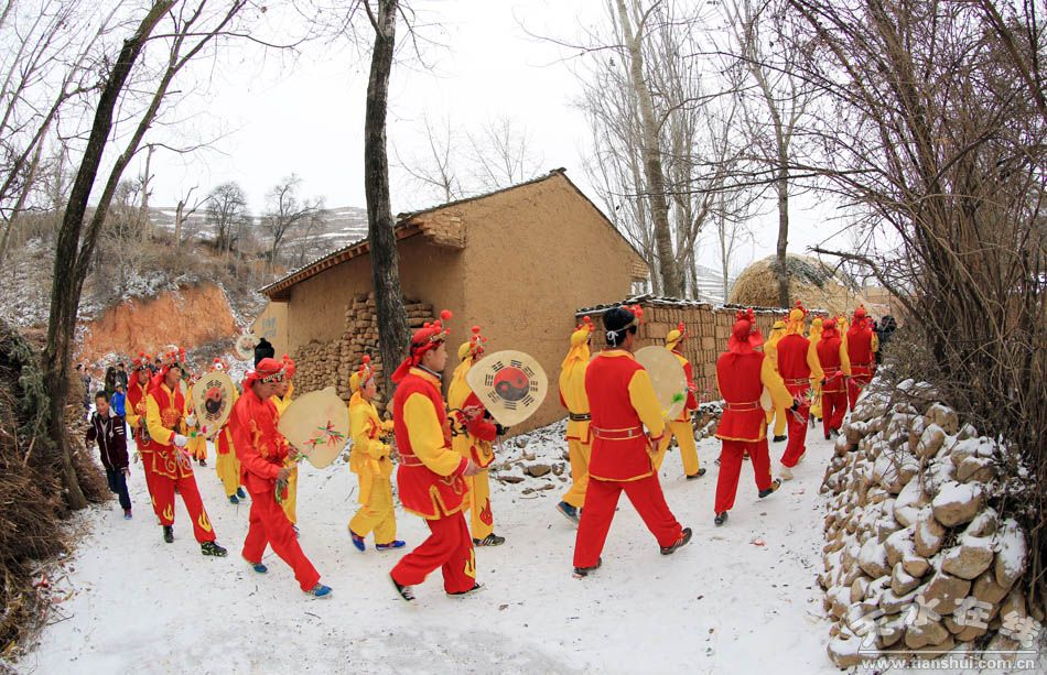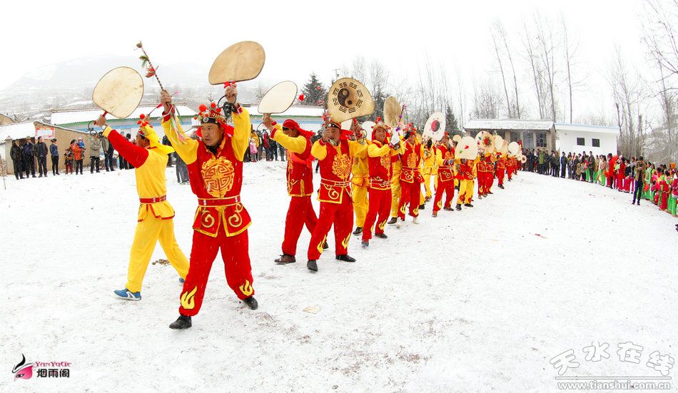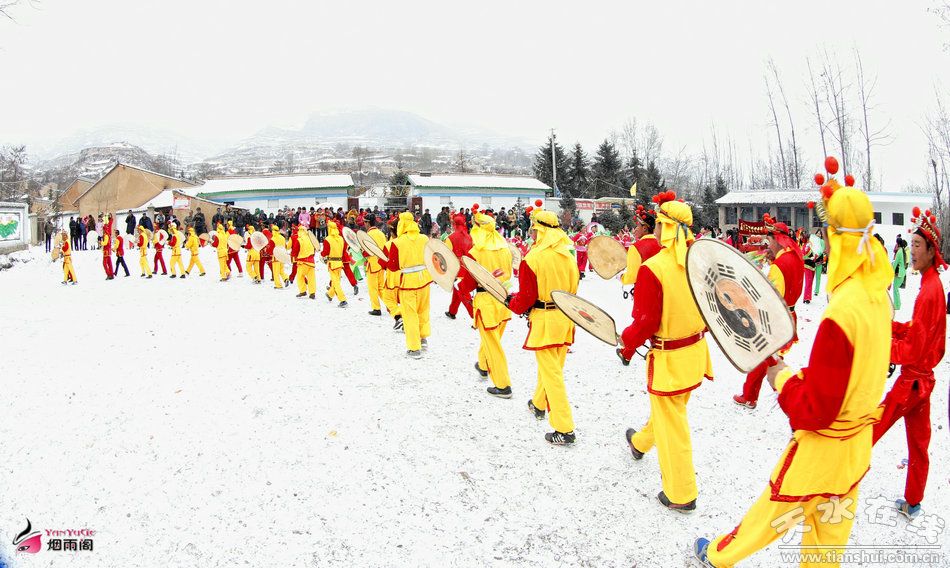 2月12日,大年初五,一場不期而至的瑞雪灑落在天水大地,天水在線一行不顧天寒地凍,道路難行,冒著大雪專程驅(qū)車來到武山縣灘歌鎮(zhèn)費莊村拍攝社火表演。