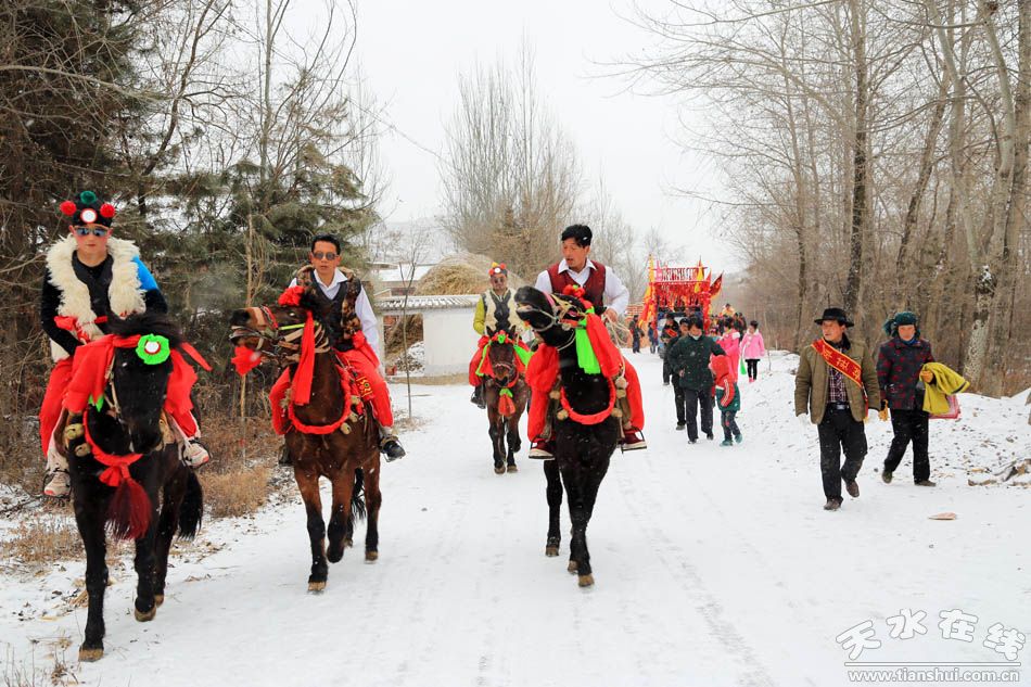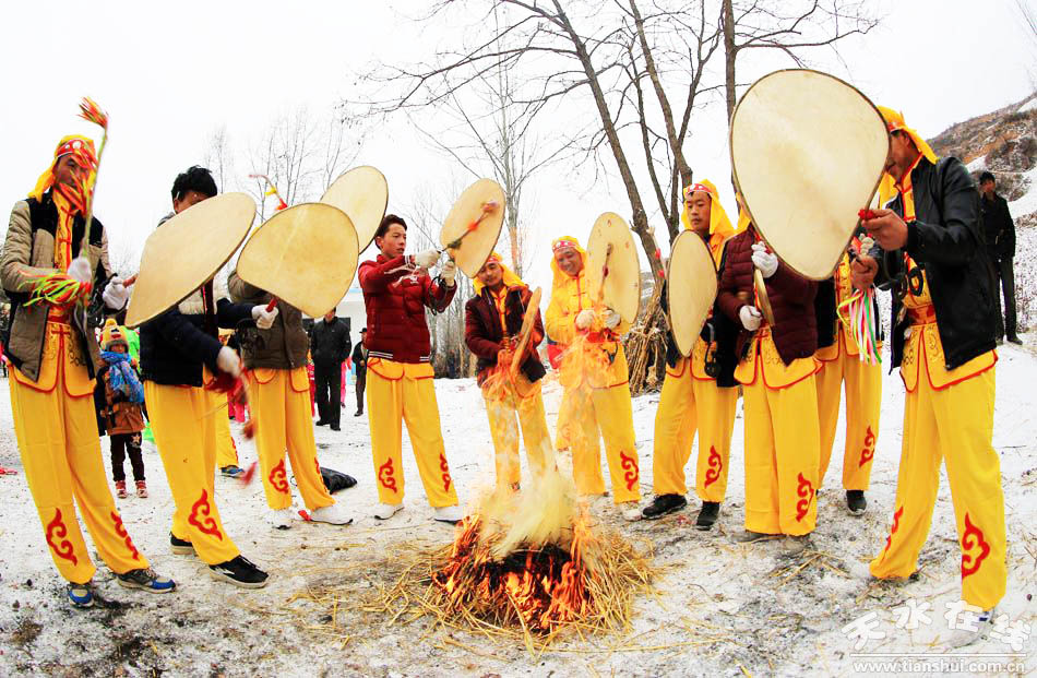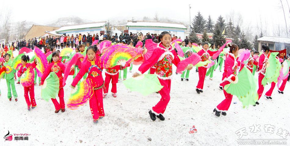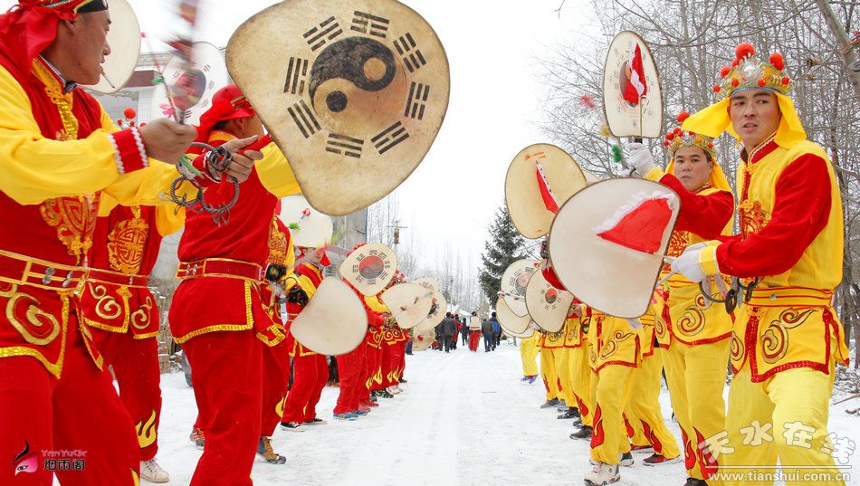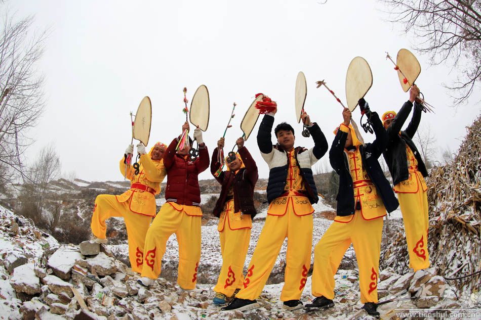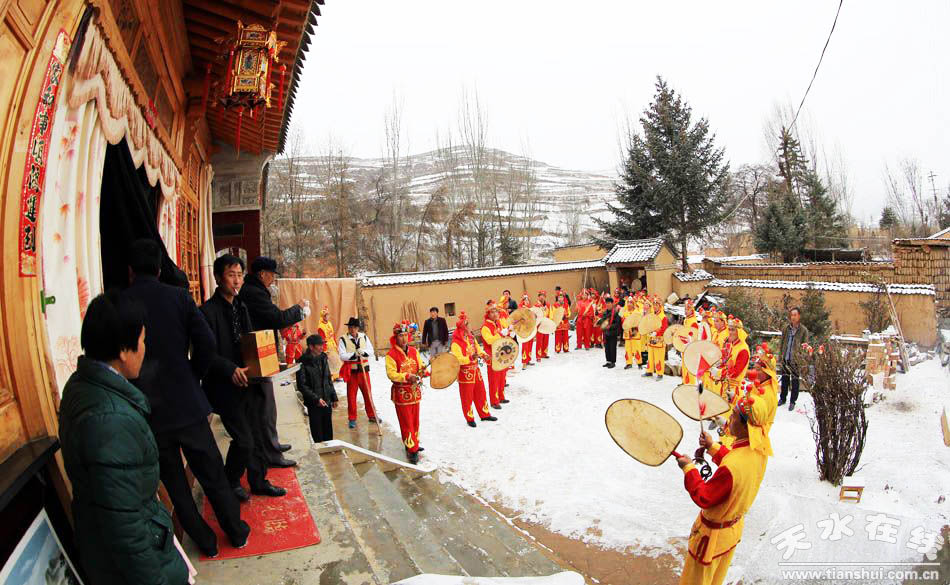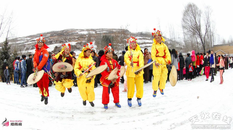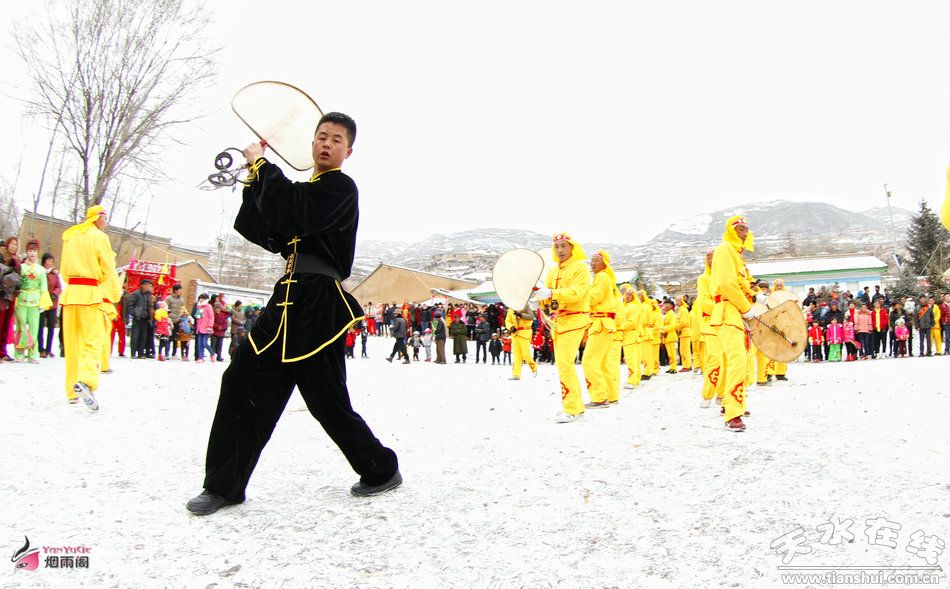 2月12日,大年初五,一場不期而至的瑞雪灑落在天水大地,天水在線一行不顧天寒地凍,道路難行,冒著大雪專程驅(qū)車來到武山縣灘歌鎮(zhèn)費莊村拍攝社火表演。
