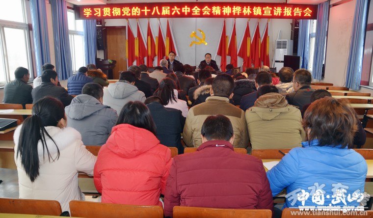1月4日,武山縣副縣長聶衛(wèi)東到樺林鎮(zhèn)宣講黨的十八屆六中全會(huì)精神。樺林鎮(zhèn)全體干部職工,各村駐村干部,村干部聆聽了報(bào)告。