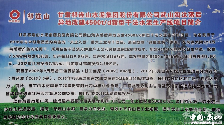 中國建材祁連山集團(tuán)武山干法水泥生產(chǎn)線技改遷建項(xiàng)目是2012年省政府與中材集團(tuán)簽約引進(jìn)的“央企入甘”項(xiàng)目之一,也是市政府確定的重點(diǎn)推進(jìn)工業(yè)項(xiàng)目。該項(xiàng)目由央企中材集團(tuán)甘肅祁連山水泥集團(tuán)公司根據(jù)企業(yè)實(shí)際情況,采取“減量置換”的辦法,淘汰關(guān)閉位于鴛鴦鎮(zhèn)的落后生產(chǎn)線,并在馬力鎮(zhèn)新建新型干法水泥生產(chǎn)線。該項(xiàng)目的實(shí)施,對于進(jìn)一步優(yōu)化資源配置,提高企業(yè)競爭力和效益,提升工業(yè)經(jīng)濟(jì)總量,推動縣域經(jīng)濟(jì)加快發(fā)展具有重要意義。 |
