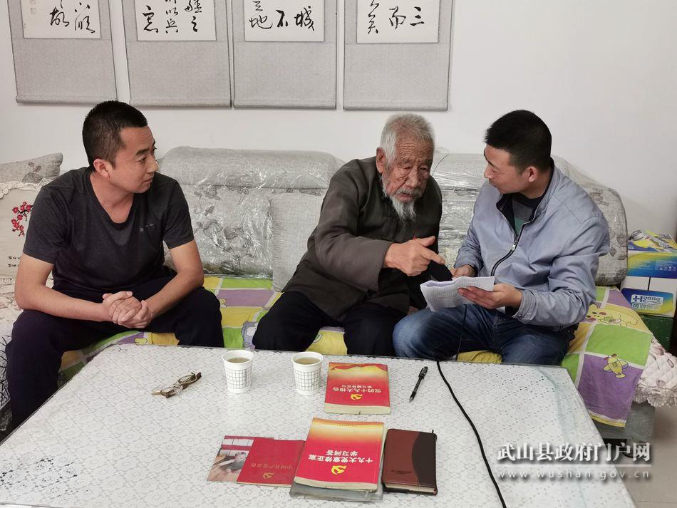 新中國成立70周年之際,武山縣洛門鎮(zhèn)在“不忘初心、牢記使命”主題教育中,為老黨員送學上門,同時聆聽老黨員講黨史、新中國史。近日,鎮(zhèn)村黨員干部來到宋莊村,走訪看望解放前入黨的老黨員宋西祥。