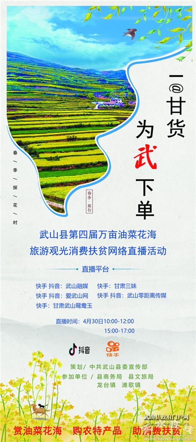 今年是決戰(zhàn)決勝脫貧攻堅之年,為積極響應(yīng)國家和省、市、縣關(guān)于消費扶貧的號召,創(chuàng)新扶貧方式,促進(jìn)鄉(xiāng)村旅游消費,釋放更大扶貧效能。以“賞油菜花海、購農(nóng)特產(chǎn)品、助消費扶貧”為主題的武山縣第四屆萬畝油菜花海旅游觀光線上直播和線下銷售活動,將于4月30日拉開序幕。