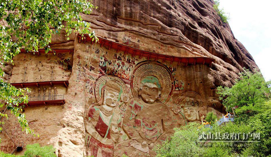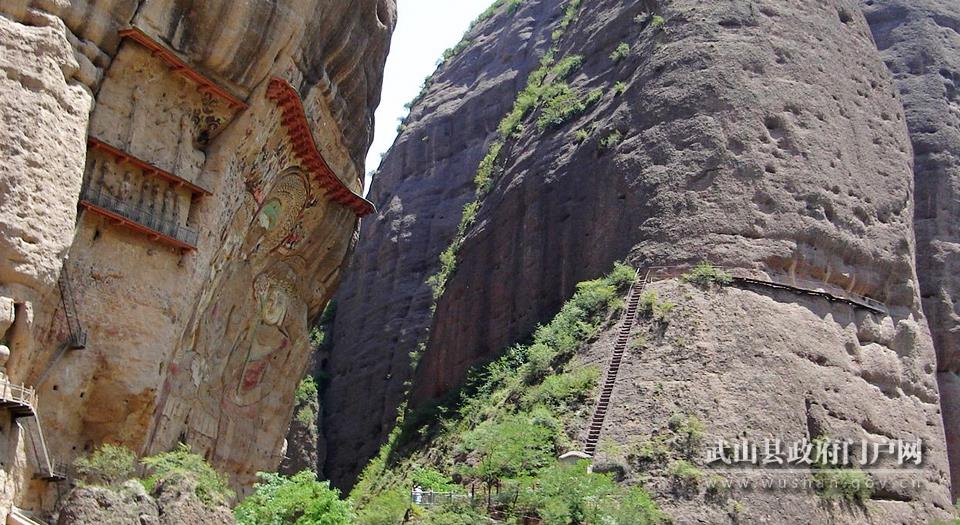 拉梢寺,又名大佛崖,始建于北周。因修建大佛時,用人工拉扯樹梢堆積修建而成,故名拉梢寺。拉梢大佛,堪稱世界第一大摩崖浮雕大佛,氣勢雄偉,古樸壯觀,是水簾洞石窟群的精華所在。該崖面通高60余米,東西兩壁寬60余米,在同一崖面上融小龕、塑像、浮雕、懸塑、壁畫和題記于一體。大佛釋迦牟尼鑿于東部崖面的正中,通高42.3米,兩側(cè)為文殊菩薩和普賢福薩,稱“華嚴(yán)三圣”。大佛背光由九層圖案組成,佛座有7層圖案,四層為仰蓮瓣,每隔一層雕塑雄師、臥鹿和白象,每層九個布局規(guī)整,形象逼真,象征威武莊嚴(yán),而把大象放為最底層體現(xiàn)了大象的穩(wěn)重憨實,也表現(xiàn)了釋迦的另一種護(hù)法形式。蓮臺上部開鑿一人字頂淺龕,龕內(nèi)懸塑一佛兩菩薩,右邊菩薩僅剩頭部,造型豐滿圓潤,神態(tài)安詳,中國文化報的記者評她的微笑比蒙娜麗莎的微笑美10倍,左側(cè)菩薩下方鑿一長方形淺龕“題記”,為大佛造像提供了準(zhǔn)確的時間,在我國和世界石窟藝術(shù)中具有獨特的代表性,是研究我國古代歷史、文化、軍事、政治和佛教的寶貴資料。