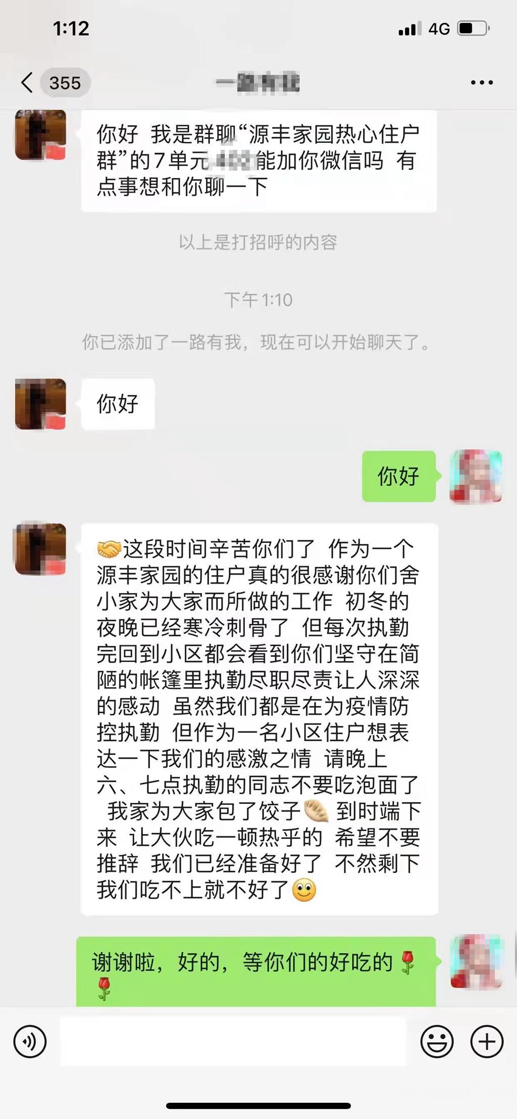 “這段時間辛苦你們了,作為一個源豐家園的住戶真的很感謝你們舍小家為大家而所做的工作……作為一名小區(qū)住戶想表達一下我們的感激之情,請晚上六七點執(zhí)勤的同志不要吃泡面了,我家為大家包了餃子,到時端下來,讓大家吃一頓熱乎的。希望不要推辭,我們已經(jīng)準備好了,不然剩下我們吃不上就不好了!11月2日中午時分,在武山縣融媒體中心堅守的源豐家園小區(qū),小區(qū)居民高凱鵬聯(lián)系上執(zhí)勤人員,將自己的感激之情傳給大家。晚上六點半,熱氣騰騰的餃子送了下來,讓寒冷的夜晚溫暖起來。