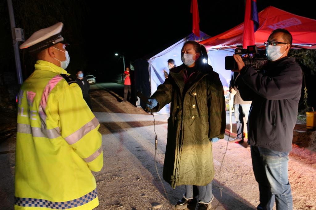 11月2日,武山縣全面管控的第二天。忙碌了一天的縣融媒體中心黨組書記、主任關(guān)招宏,腳步不停歇,到單位吃了桶方便面后,在寒風(fēng)凌冽的夜晚,又帶領(lǐng)記者蒲愛民、管秋勇、楊同慶先后到高速武山出口、山丹鎮(zhèn)任門村防疫點(diǎn)、灘歌鎮(zhèn)賀岷公路王磨、南溝疫情防控點(diǎn),用鏡頭和筆尖記錄了值守點(diǎn)工作人員在寒夜里對過往的車輛和進(jìn)出人員逐一檢查的場景。深夜,寒氣逼人,采訪組卻沒有一位同志喊冷。隨著閃光燈的不斷閃爍,他們將各值守點(diǎn)感人的瞬間定格。出門天微亮,歸來已凌晨。寫稿子、剪素材、選照片、制作短視頻、H5海報。上午9時,《致敬!夜幕下的“疫”線守護(hù)者》已在中心所屬10個平臺同步播發(fā)。