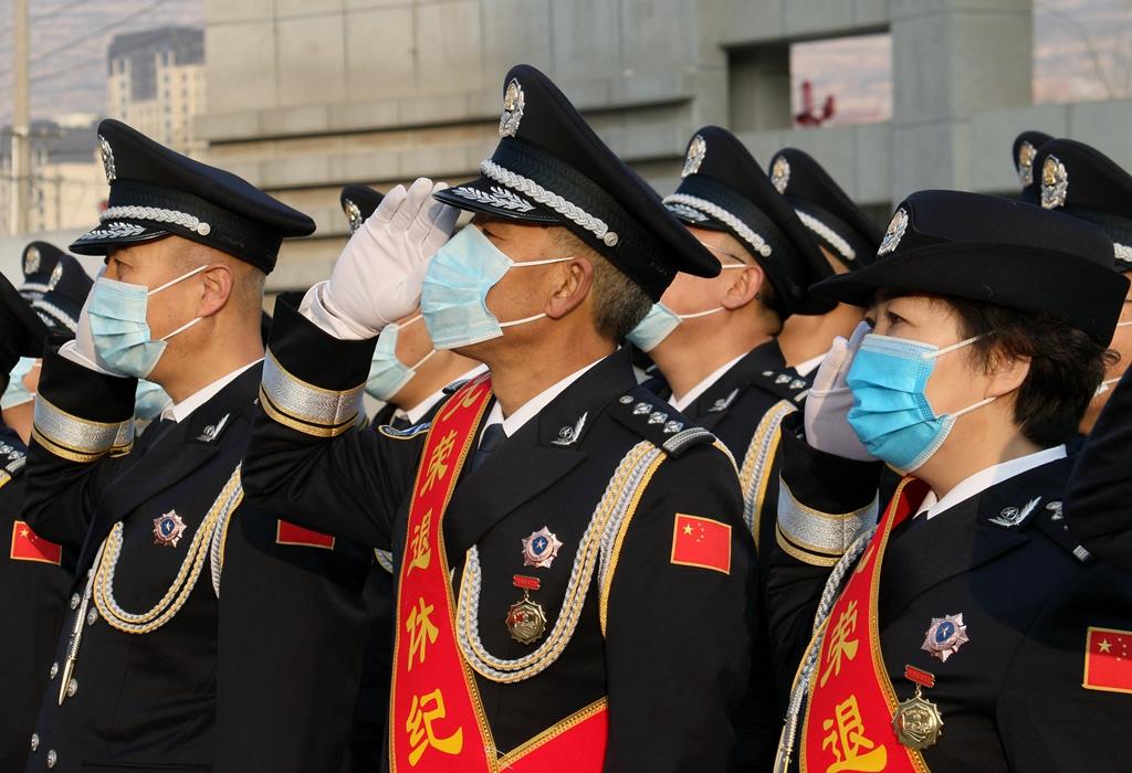 上午9時整,伴隨著雄壯激昂的《義勇軍進行曲》,慶;顒诱嚼_帷幕。指揮員下達“迎警旗”口令,儀仗隊英姿挺拔、精神抖擻、步伐鏗鏘、手執(zhí)鋼槍護衛(wèi)著警旗正步走向升旗臺。伴著雄壯嘹亮的《中國人民警察警歌》,擎旗手揮臂揚旗,中國人民警察警旗冉冉升起,全場肅立,全體民警面向警旗敬禮。隨后,全體民警重溫《公安機關(guān)人民警察誓詞》,令軍強、溫阿軍分別向退休民警代表頒發(fā)光榮退休紀(jì)念章和紀(jì)念杯。