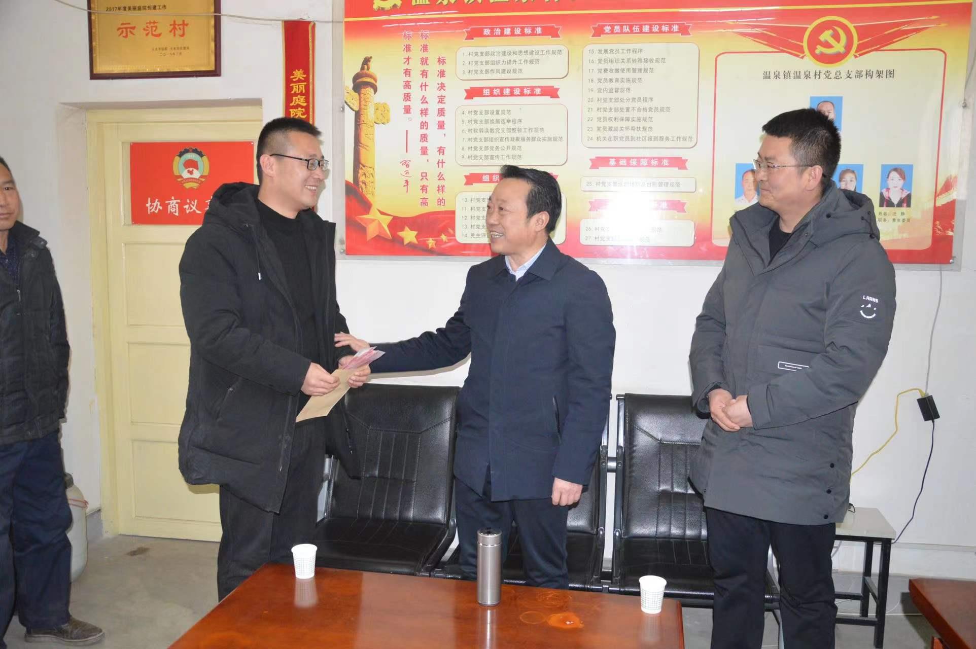 在溫泉村村委會,孫德銀對優(yōu)秀駐村干部代宏亮積極投身一線的工作精神和為群眾辦實事的工作成效給予了充分肯定。鼓勵他樹牢以人民為中的發(fā)展思想,主動擔(dān)當(dāng)作為,真正融入群眾,繼續(xù)發(fā)揚不怕苦、不怕累的作風(fēng),扎實做好工作,讓更多群眾享受到實實在在的實惠。同時要求鎮(zhèn)村兩級時刻關(guān)心關(guān)注困難群眾的生產(chǎn)生活情況,主動為他們排憂解難,讓他們實實在在感受到黨和政府的溫暖,確保他們過一個溫暖祥和的春節(jié)。