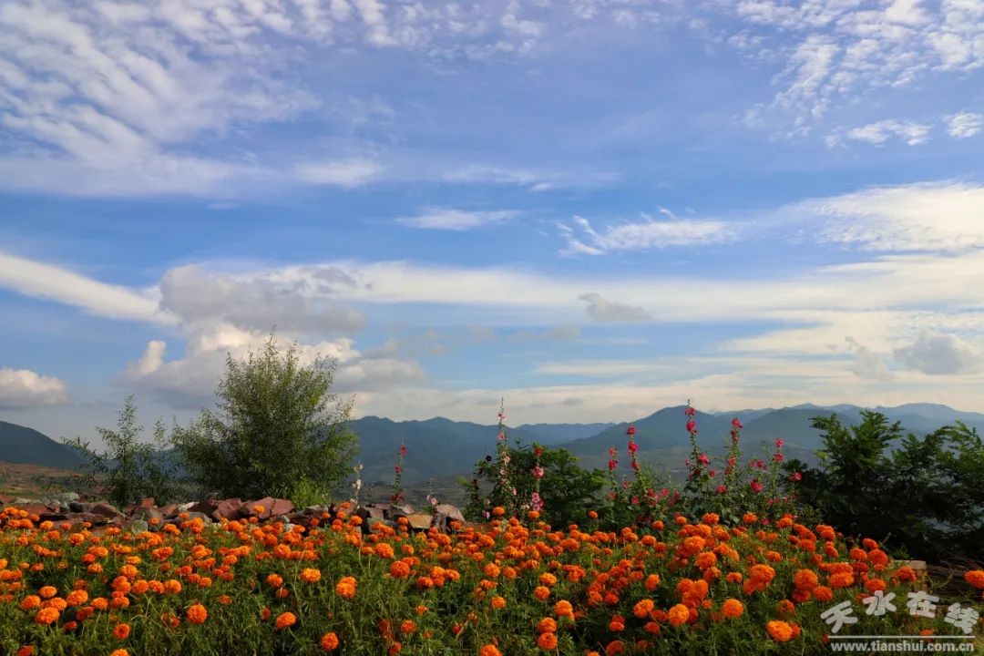 龍臺鎮(zhèn)馬年村,是一個云端上的村莊。這里有萬畝梯田,有萬壽菊香,有青磚伴瓦漆,有云海落斜陽,有小徑盡頭是人家,有花海深處醉蜂蝶?梢缘歉吒╊Ю锝,也可伴著花香談笑在廊道。