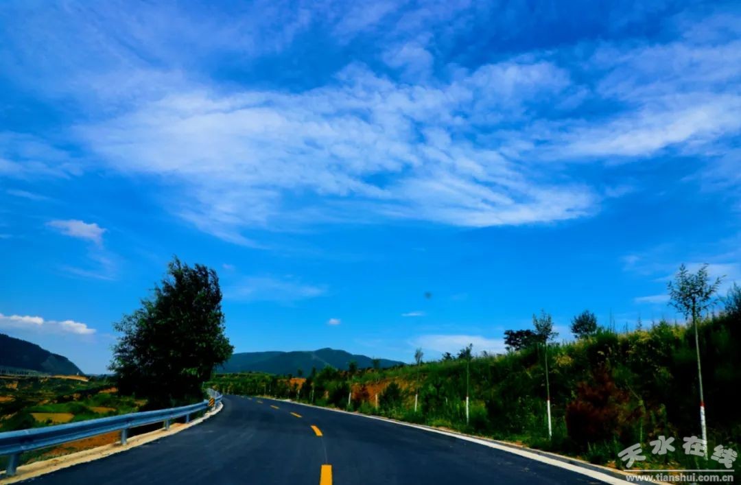 沿著寬闊的四馬公路,一直向西,沿途天高云淡,梯田重疊,綠樹成蔭,村落靜謐在溝壑之間,山巒起伏,綠峰聳立。山梁上的公路,似登天之梯,盡頭定是幸福的彼岸。一路伴著花香而去,一路亦醉在山水之間。