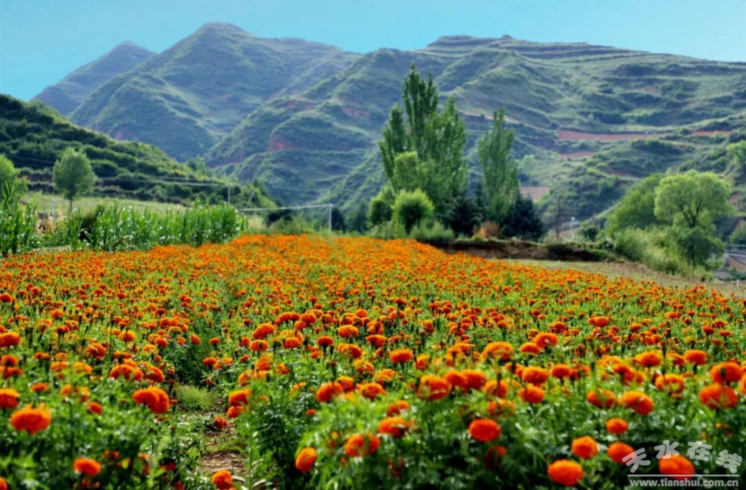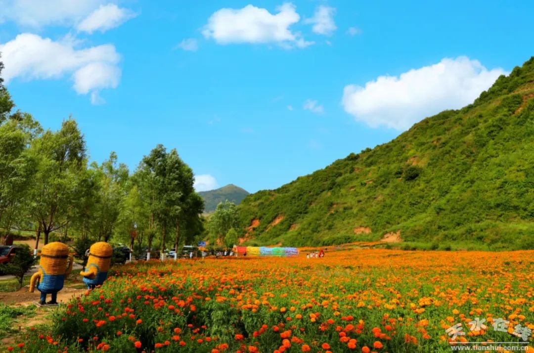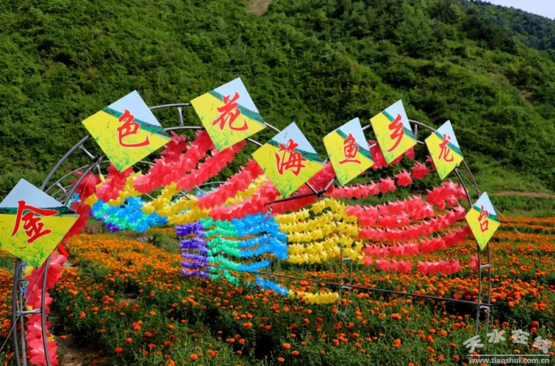 夏日的龍臺鎮(zhèn)董莊村,是一個花的海洋。金黃的萬壽菊鋪滿了鄉(xiāng)間小路,公路兩側(cè)的花田一望無垠,十里飄香,游人眷戀。清澈見底的溪流映著藍天、白云和屋舍。愛美的人此刻已經(jīng)站滿了田間地頭,時而掩面耳語,時而靜若處子,時而拈花一笑,時而成群歡言,盡情的在金色花卷里擺弄著風(fēng)姿,盡情地徜徉于這一片金色汪洋。做一個天地間最悠閑的過客。閉眼,吟詩釋懷,憶相思,一任清香入鼻耳。