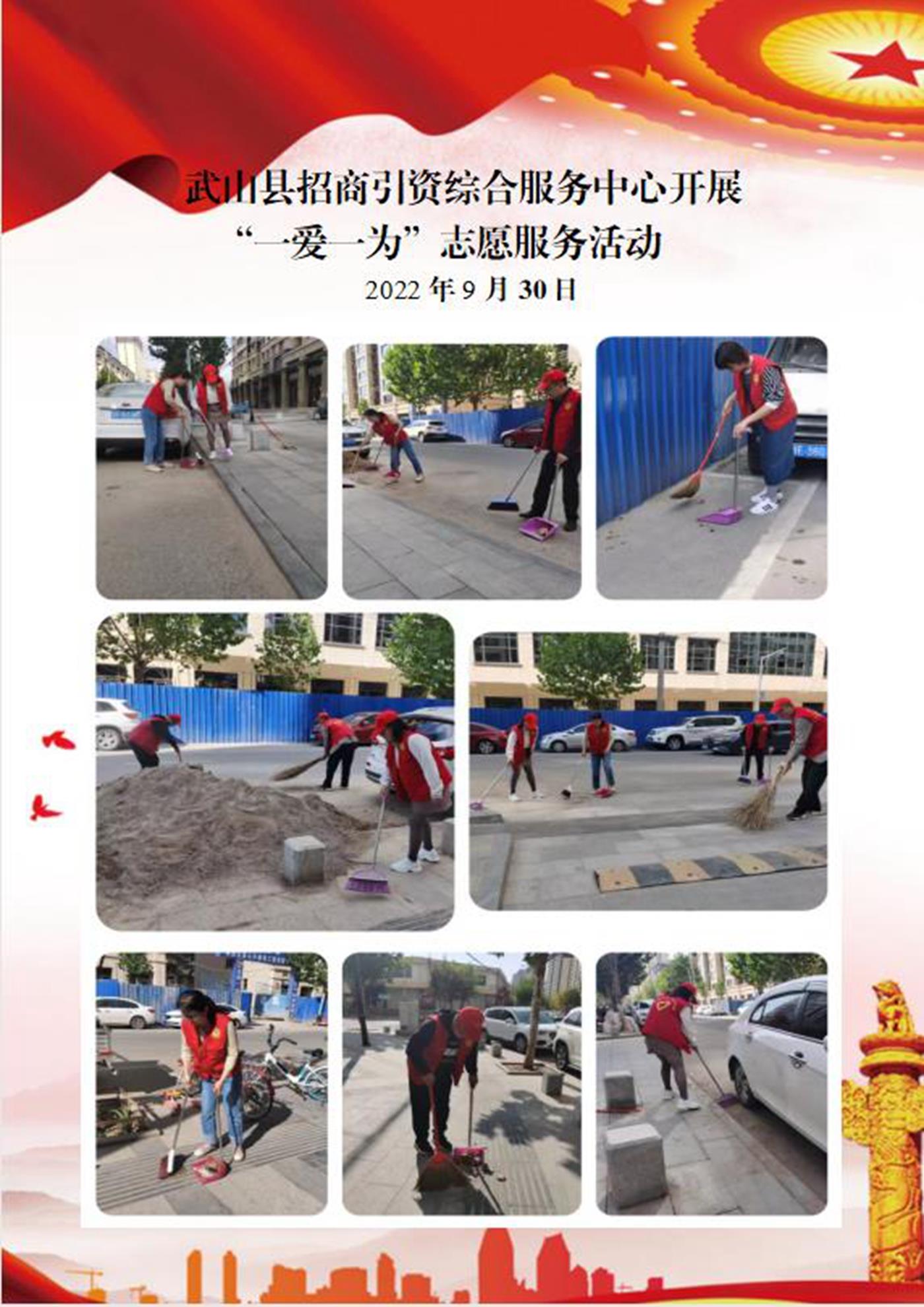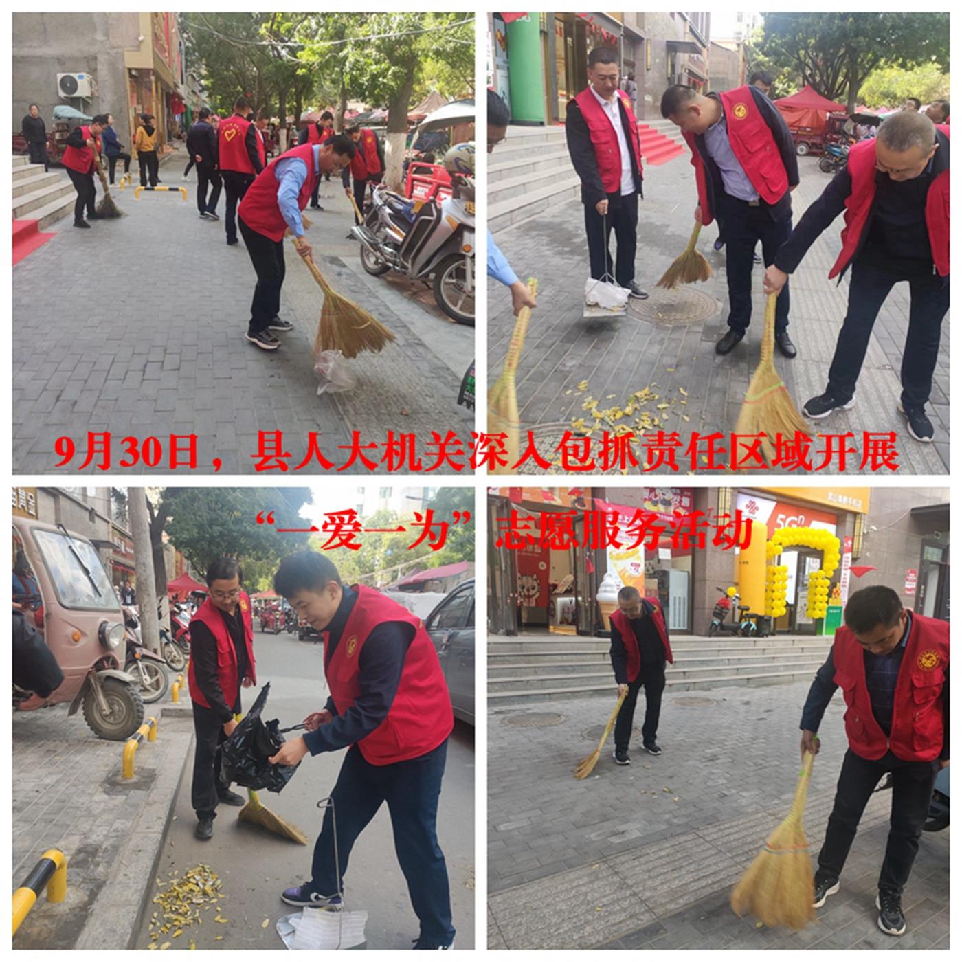 活動中,大家認(rèn)真將縣城河道、墻面、道路邊的落葉、白色垃圾、煙頭、紙屑、雜亂廣告等廢棄物清掃干凈,不留衛(wèi)生死角。一個個身著紅馬甲的志愿者將“文明”化作一個個具體行動,將志愿服務(wù)工作延伸到每個角落,喜迎新中國73周年華誕。