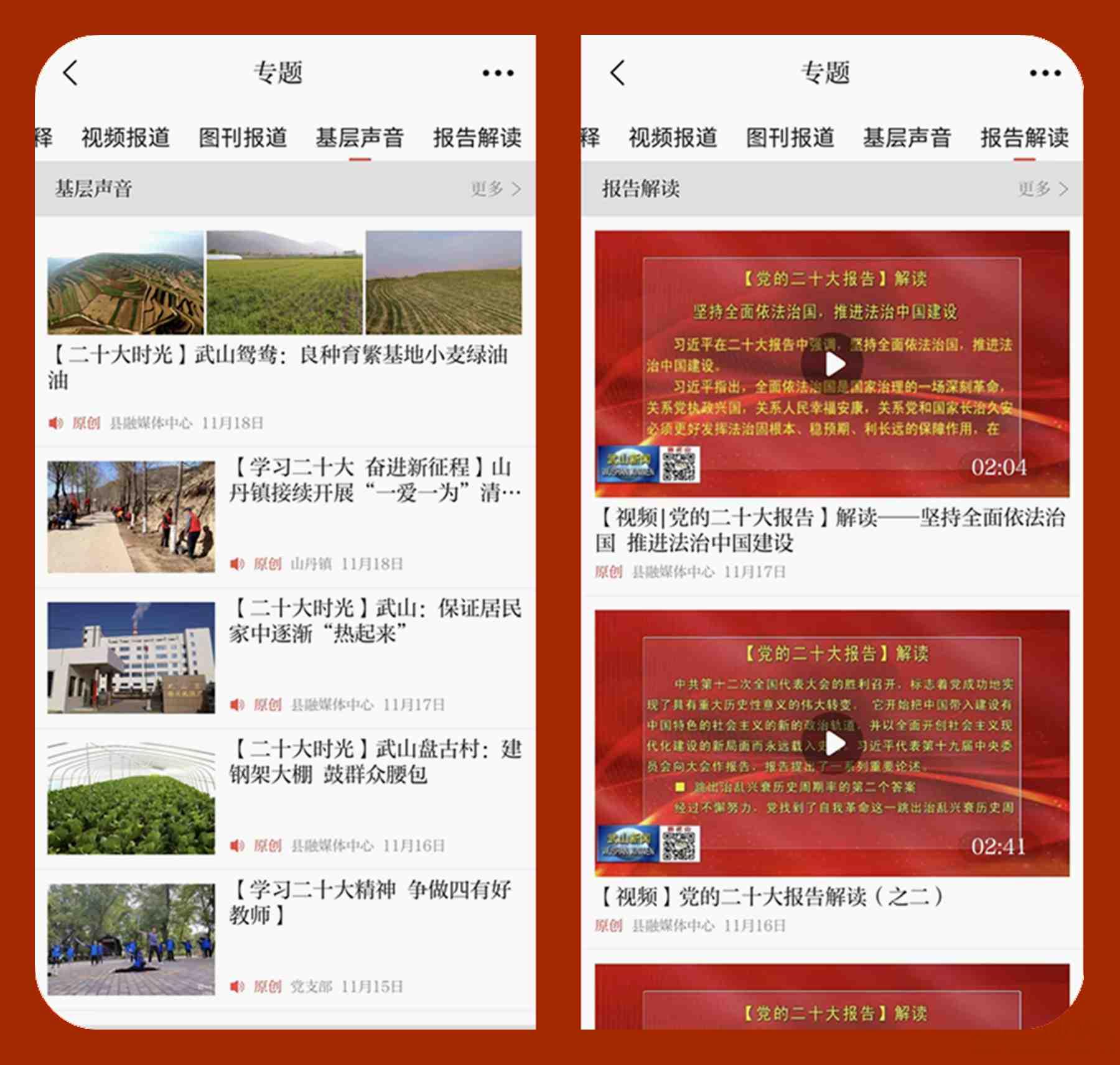 該專題分為精神宣講、學習感悟、理論闡釋、視頻報道、圖刊報道、基層聲音和報告解讀七個欄目,從多方面多形式多角度宣傳闡釋黨的二十大精神。其中“精神宣講”欄目,展現中央和省、市、縣宣講團二十大精神宣講及全縣各鄉(xiāng)鎮(zhèn)各部門各單位學習貫徹黨的二十大精神宣講會等內容;“學習感悟”欄目,展現全縣各鄉(xiāng)鎮(zhèn)各部門各單位中心組學習黨的二十大精神情況,充分反映全縣廣大黨員干部群眾對黨的二十大精神的深切感悟;“理論闡釋”欄目,集納專家學者對黨的二十大精神的理論解讀,定期推送權威信息和理論文章;“視頻報道”欄目,展現縣融媒體中心精心打造的《主播帶你學報告》《二十大知識快問快答》等新媒體作品,通過多媒體表現形式讓黨的二十大精神聽得懂、能領會、可落實;“圖刊報道”欄目,以海報和圖片的形式集納黨的二十大報告應知應會知識和全縣廣大干部群眾學習宣傳貫徹黨的二十大精神精彩瞬間;“基層聲音”欄目,展現全縣各鄉(xiāng)鎮(zhèn)各部門各單位對黨的二十大精神的學習領會和貫徹落實情況;“報告解讀”欄目,集納中央和省、市、縣主要媒體對黨的二十大報告的詳細解讀。
